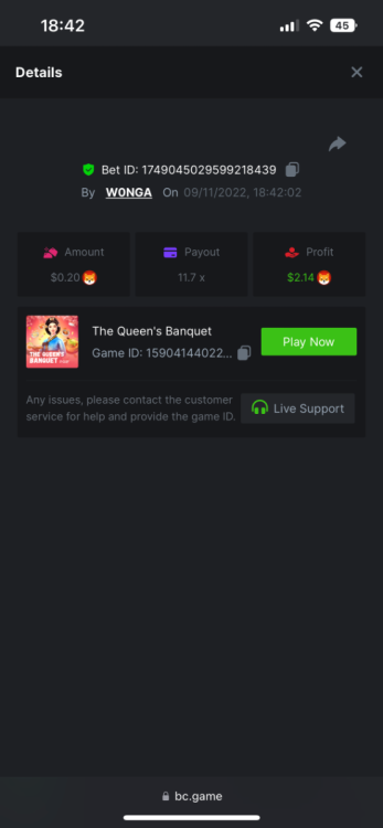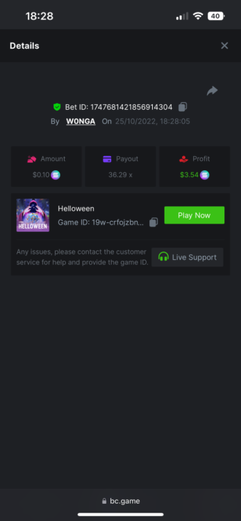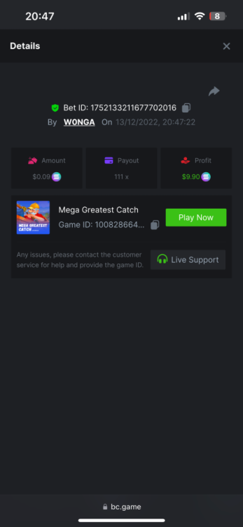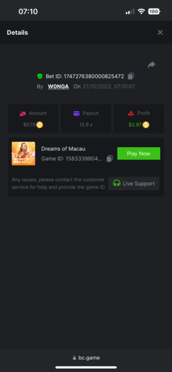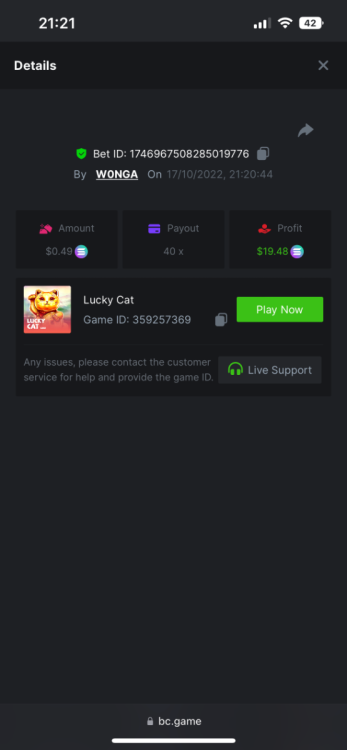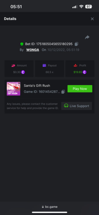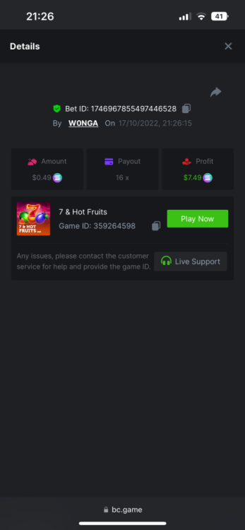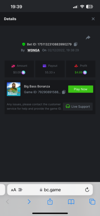 5. https://bc.game/#/sd/10YFF23M9VN76B This was a clean 50x win on $0.10! But the the dollar conversion says different. https://bcgame-dk2.pragmaticplay.net/gs2c/lastGameHistory.do?symbol=vs10bbbonanza&mgckey=AUTHTOKEN@11cc628b718a1c586678b11736e84ea3dfa730c7917478308de6e25bef028d13~stylename@bcgame_bcgame~SESSION@23942c19-4f81-4335-ac9a-6cefff7f9a75~SN@192ffaf4&tz=-00%3A00&mgckey=AUTHTOKEN@11cc628b718a1c586678b11736e84ea3dfa730c7917478308de6e25bef028d13~stylename@bcgame_bcgame~SESSION@23942c19-4f81-4335-ac9a-6cefff7f9a75~SN@192ffaf4 https://bc.game/#/sd/10YFG753VMQS5V https://bc.game/#/sd/10YFGJAIT2RMS3 https://bc.game/#/sd/10YFGXMC5YV8K3 https://bc.game/#/sd/10YGZ4VK6RWOIB