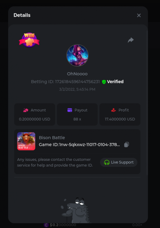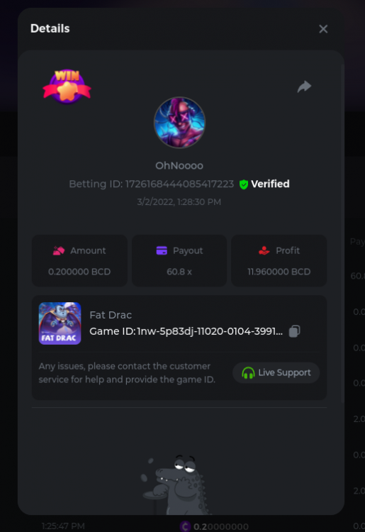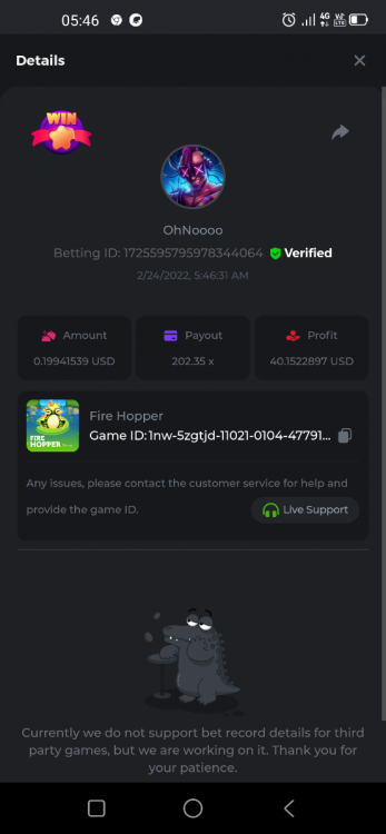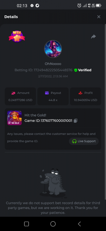 Golden Dancing Lion x 177.2 Betting ID: 1724947781266571904 Hit the Gold! x 44.8 Betting ID: 1724948222505448576 Tiger Jungle x 93 Betting ID: 1725143498319811079 Solar Queen x 47 Betting ID: 1725006049288958592